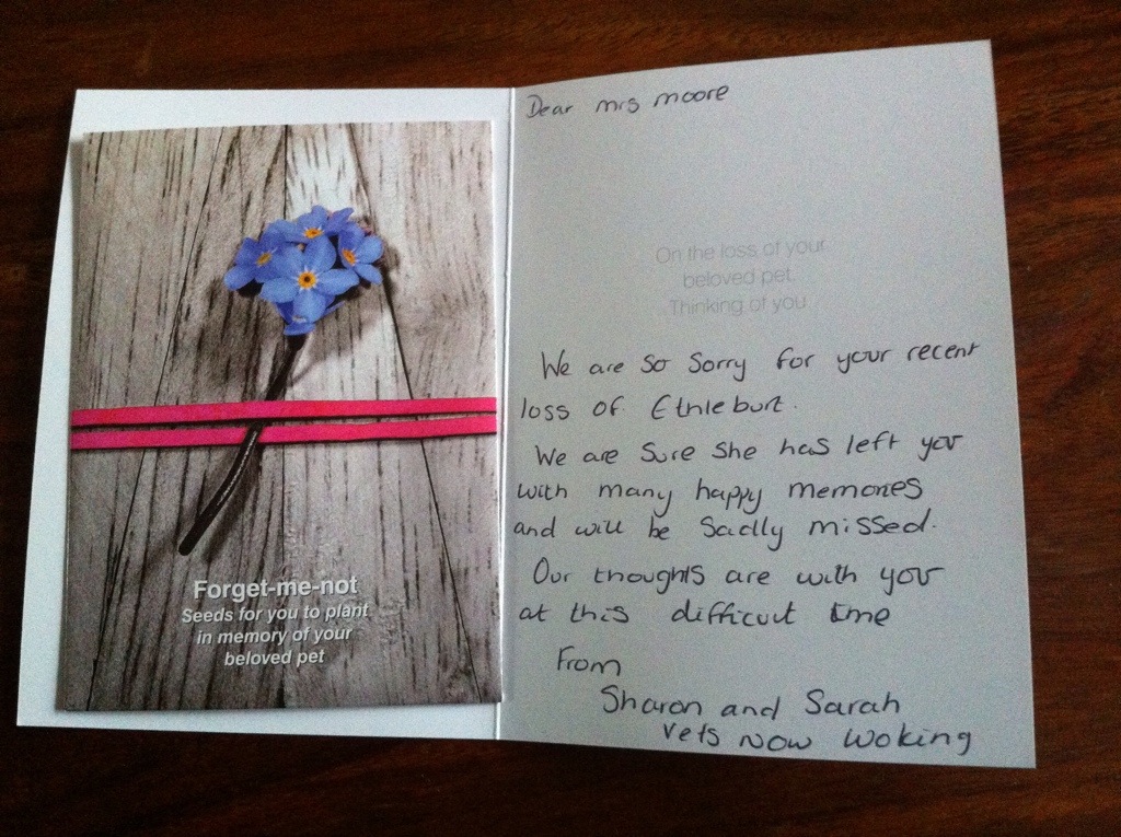 A couple of days ago I received a card from the emergency team who tried to save Ethel’s life. Enclosed in the card was a packet of forget-me-not seeds to plant round her grave. Although upset, I was touched at such a lovely thought, and a very fitting one too. For we never will forget our beautiful Ethelbert, the original chuffin cat.