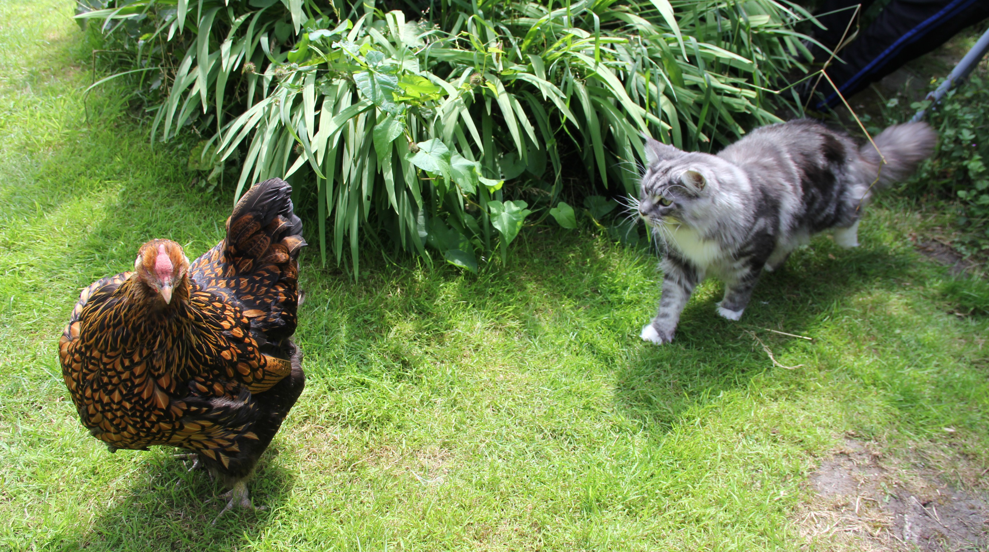 Doris hopped outside, having found an interesting speck of nothingness to peck. As I followed her out of the coop, I pulled the door closed behind me… and turned to discover a fluffy face looking back at me. Yes, the cat was sitting inside the chicken coop, and the chicken was gleefully stomping about outside in the garden! Doris thought this was hilarious, and in an act of blatant bravado she kept waddling up and pecking the outside of the enclosure. I had never seen Gloria so subdued, her whiskers twitching as she blinked her big, green eyes. It wasn’t easy trying to swap the occupants over, believe me.